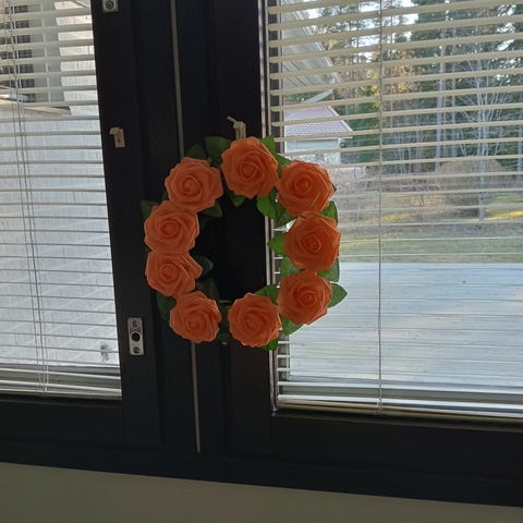 Tekokukka kranssi oveen tai seinälle. Takana ripustuslenkki. Halkaisia noin 38cm