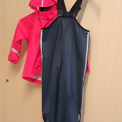 Reiman sadeasu. Pinkki takki ja tummansiniset henkselihousut.