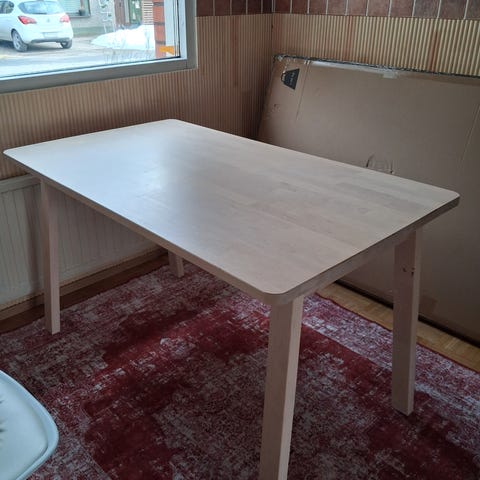 Maskun ruokapöytä. Koko 180 & 100.yleisilme siisti. Tukeva. Pöydän pinnassa jotain läikkiä. Voi lähteä puhdistamalla