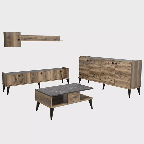 Nosta olohuoneesi tasoa hienolla olohuoneen kalustesarjalla, joka on suunniteltu tuomaan tilaan sekä tyyliä että toiminnallisuutta. Tämä setti on valmistettu 100-prosenttisesti melamiinipinnoitetusta lastulevystä, ja se on rakennettu kestämään aikaa ja aikaa. Vapauta eleganssiTyylikkään ja modernin muotoilunsa ansiosta tämä huonekalusarja muuttaa olohuoneesi välittömästi hienostuneeksi turvapaikaksi. Tammen ja marmorin värien yhdistelmä luo upean kontrastin, joka lisää ripauksen ylellisyyttä mihin tahansa tilaan.Loppumattomat mahdollisuudetTässä tv-telineen, hyllyn, konsolin ja sohvapöydän sisältävässä sarjassa on lukuisia hyllyjä ja säilytysmahdollisuuksia, joiden avulla olohuoneesi pysyy järjestyksessä ja sotkuisena. Näyttele suosikkikirjojasi, perhevalokuvia tai koriste-esineitä tilavilla hyllyillä, kun taas konsoli tarjoaa runsaasti tilaa medialaitteillesi. Monipuolinen ja käytännöllinenTämä huonekalusarja ei ainoastaan paranna olohuoneesi esteettistä ilmettä, vaan se tarjoaa myös käytännöllisyyttä. Hyllyt voidaan helposti kiinnittää seinään, mikä antaa vakautta ja takaa tavaroiden turvallisuuden. Tekniset tiedot:Materiaali: Materiaali: 100 % melamiinipinnoitettu lastulevyPaksuus: 18 mmTV-telineen koko: cm, korkeus: 44. 8 cm, syvyys: 34. 6 cm.Hyllyjen koko: Hyllyjen koko: cm, korkeus: 35 cm, syvyys: 19. 3 cm.Konsolin koko: Korkeus: 77. 8 cm, syvyys: 41 cm.Sohvapöydän koko: cm, korkeus: 35. 6 cm, syvyys: 54 cm.Väri: Tammi ja marmoriLukuisat hyllyt tarjoavat runsaasti säilytystilaaPäivitä olohuoneesi olohuoneen kalustesarjalla jo tänään ja koe tyylikkyyden ja toiminnallisuuden täydellinen yhdistelmä. Luo tila, joka kuvastaa henkilökohtaista tyyliäsi, ja nauti sekasorrosta vapaan ympäristön tuomasta mukavuudesta.