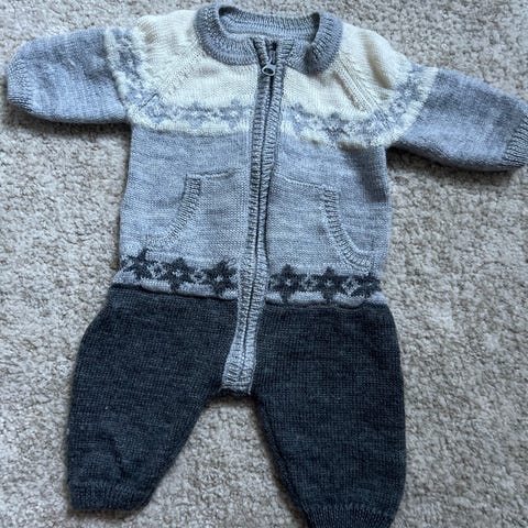 Kaksi vauvan haalaria koossa 56, sopii pienen vauvan ulkoiluun. Newbien valkoinen tikkihaalari on puuvillaa, hihat ja lahkeet saa käännettyä umpinaiseksi. Huppu, joka lämmittää hyvin niskaa ja päätä. Mukana on myös yksivärinen, ohut vetoketjullinen villahaalari (80% villa, 20% polyamidi) merkkiä Ciraf, joka sopii tikkihaalarin alle.