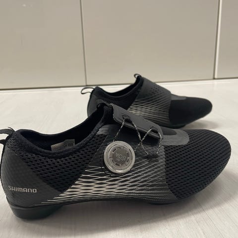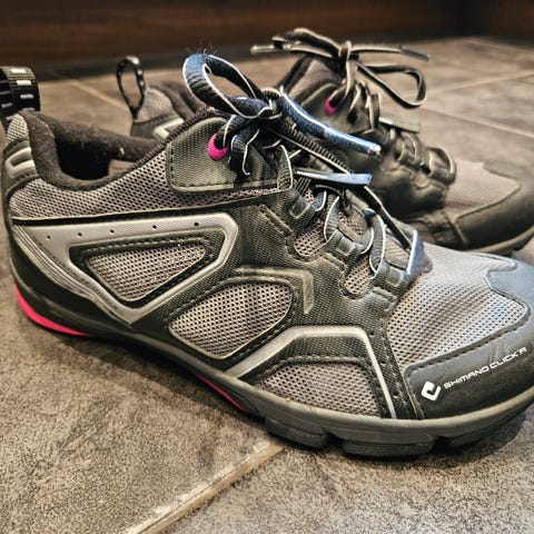 Shimano SPD -pyöräilykengät, koko 38. Kengissä on SPD-klossikiinnitys pohjassa ja ne soveltuvat poljinjärjestelmään, joka käyttää kaksipulttisia klosseja. Päällinen on harmaata tekstiilimateriaalia, jossa on synteettisiä vahvikkeita. Kiristys tapahtuu BOA-tyyppisellä säätönupilla.