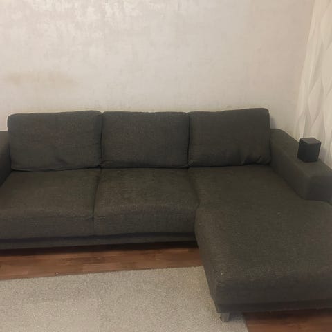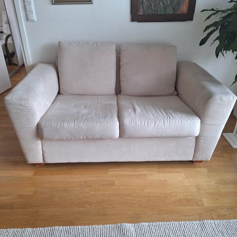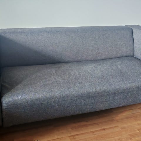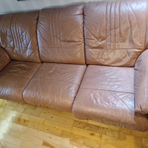 Annetaan kulmasohva jonka nahka päässyt jo ajansaatossa rikkoutumaan. Itse olen pitänyt vilttejä/taljoja sohvan päällä.