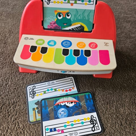 Tukeva ja kauniisti soiva leikkipiano. Voi soittaa koskettimia tai laittaa napista melodioita soimaan. Oli meidän taaperon suosikki kun hän tykkäsi tehdä tanssiesityksiä. "Nuottikortteja" kolme kpl, niissä naarmuja. Piano oikein hyvässä kunnossa, vaikka paljon soiteltu.