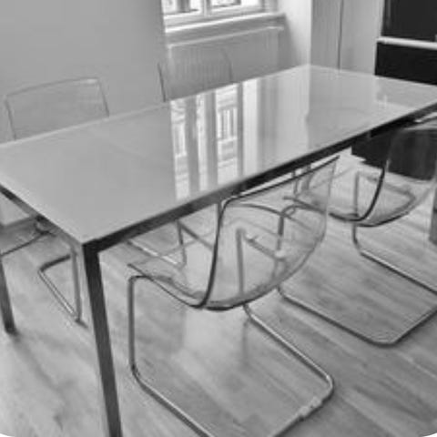 Tyylikäs Ikea Glivarp malliston moderni ruokapöytä, jossa on lasinen pöytälevy ja metalliset jalat. Pöytä on laajennettavissa keskeltä mekanismilla, mikä tekee siitä käytännöllisen valinnan erilaisiin tilaisuuksiin ja tiloihin. Lasipinta tuo keveyttä ja avaruutta huoneeseen, kun taas metallirunko antaa sille tukevuutta ja kestävyyttä. Käytön jälkiä pöydässä ja lisäksi pintalikaa lasin ja rungon väleissä, joka voi vaatia puhdistusta.