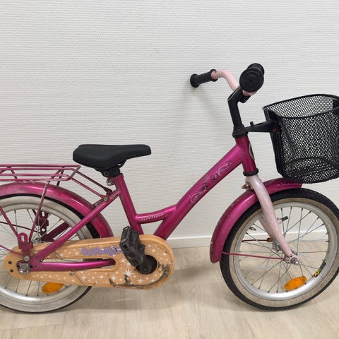 lasten polkupyörä 16" renkailla. Rungon väri pinkki-valkoinen, koristekuvioita rungossa ja ketjusuojassa. Pyörässä on matala runko helpottamaan kyytiin nousua, täyskoteloinen ketjusuoja, takalokasuoja ja etulokasuoja sekä takatavarateline. Jalkajarru takana Satula ja ohjaustanko ovat säädettävissä lapsen pituuden mukaan.