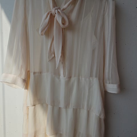 Beige mekko irroitettavalla vyöllä. Koko S, reilu mitoitus.