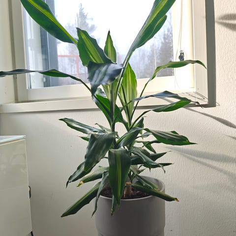 Noin metrin korkuinen traakkipuu. Kasvaa pituutta nopeasti kun latvaan kasvaa säännöllisesti uusi lehti. Hyvässä kunnossa, helppohoitoinen. Osassa alimmista oksista vähän repeämiä, näkyy kuvissa. Ei ötököitä tai muita ongelmia.
