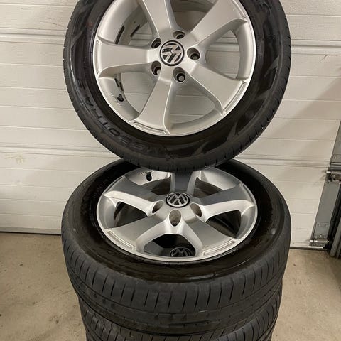 Vw alkuperäis vanteilla. Kumeissa noin 6mm pintaa kaikis. Vanteis pientä lakkavikaa yms näkyy kuvissa. Kuva pahimmasta vanteesta muut pykälää parempia. 7x16” et 45 5x112 kr 57.1