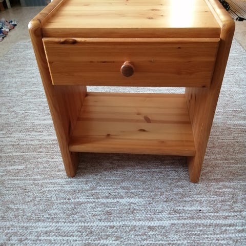 Yöpöytä, jossa on yksi laatikko yläosassa ja avoin hyllytila alhaalla. Soveltuu käytettäväksi sängyn vieressä tai pienenä sivupöytänä esimerkiksi olohuoneessa. Puuosissa näkyy luonnollinen puunsyykuviointi.
