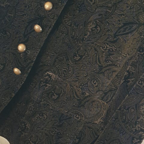 Herkkä kukkakuosi, päälikangas silkki-pellava-puuvilla, kevyet muotolaskokset antavat hyvän istuvuuden, käytännölliset, huomaamattomasti sivusaumoihin upotetut taskut, tyylikäs epäsymmetrinen napitus, koko L. Mittoja: olka-helma 71 cm, kai-kai 52 cm, vyötärön ymp.98 cm, ( + tai - senttejä saa napin siirrolla n. 5 cm ).