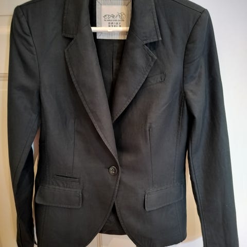 Musta pellava jakku puolipitkillä hioilla.Jakussa frilla reunoitus ja edestä nauha kiinnitys.Ei vuorta.