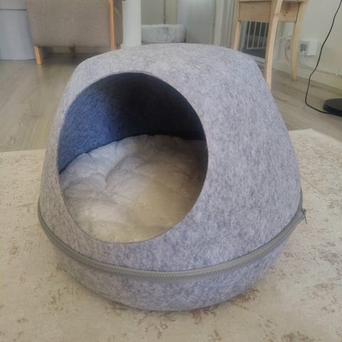 Kissan tai pienen koiran pesäluola vaaleaa, pehmeää plyysikangasta.
