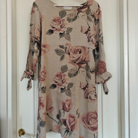 Hyväkuntoinen tummansininen tunika. Tyköistuva miehusta, levenevä helma. Vajaamittaiset hihat. Pellavaa.