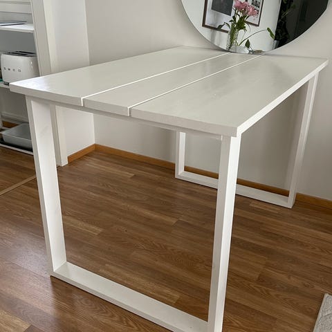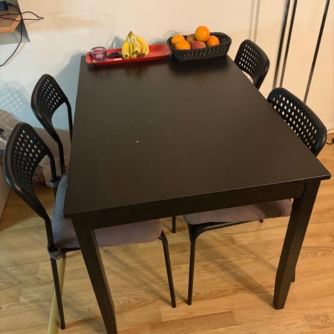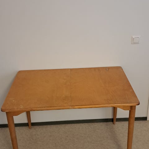Kevytrakenteinen neljän hengen ruokapöytä. Pinnassa on jälkiä mm. maalauksesta, enimmäkseen pöytälevyn reunoissa.