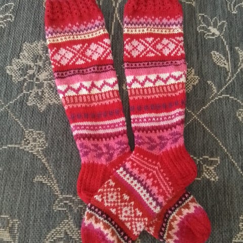 Neulottu Novita 7-veljestä langalla. Pohjan pituus 27 cm