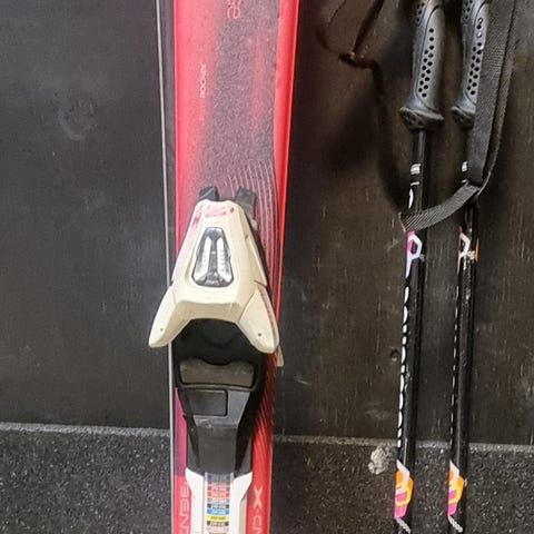 Atomic laskettelusukset siteillä. Mukana laskettelusauvat. Sukset ja sauvat sopivat rinnelaskuun. Väri vaalea, yksityiskohtia harmaalla ja punaisella. Materiaali tyypillinen laskettelusuksien komposiittirakenne metallivahvistuksin. Siteet asennettu suksiin valmiiksi. Monot n 44