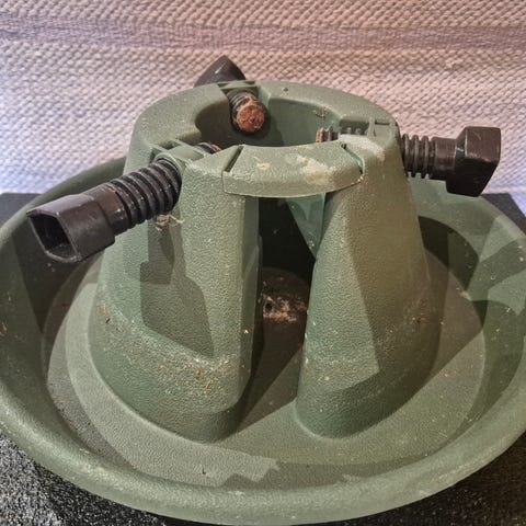 Vihreä keinotekoinen joulukuusi ja seppele jalustalla.
