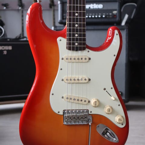 Made in USA pleksi Stratocastereille, väri ehkä joku valkoisen ja parchmentin välimaasto. Tämä tuli itelle palacaster-projektissa, myyjän mukaan pleksi on fenkun big apple - stratosta. Ainakin on usa-tarrat, ja sopivuus fender-runkoihin.