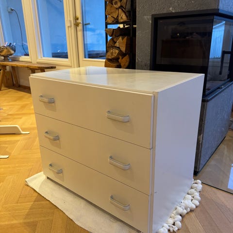 Kuvan mukaisessa kunnossa oleva valkoinen lipasto, mekanismit toimii, mutta ylä ja ala peitelistat menneen siirtelyssä poikki