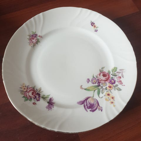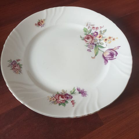 Arabia lautaset, valkoinen pohja ja monivärinen kukkakuviointi reunoilla. Pyöreä muoto ja kevyesti aaltoileva reuna. Sopivat esimerkiksi kattaukseen kahvi- tai jälkiruokatarjoiluun. Materiaalina lasitepintainen keramiikka/posliini. Yksi särö.