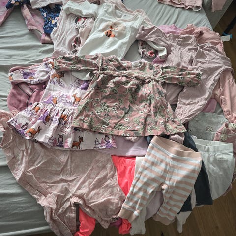 Myydään vaatepaketti, koko 62. Sisältää 5 kpl pitkähihaisia bodyja, 1 lappufarkut sekä 3 kpl housuja.