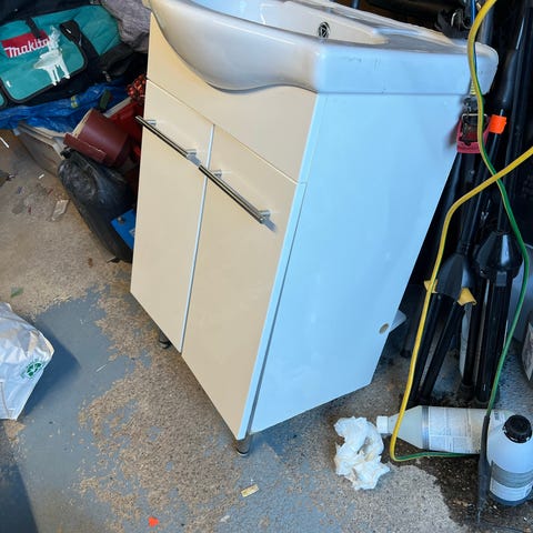 Mattapintainen valkoinen kylpyhuoneen allaskaappi. Kaappi soveltuu pesualtaan alle.