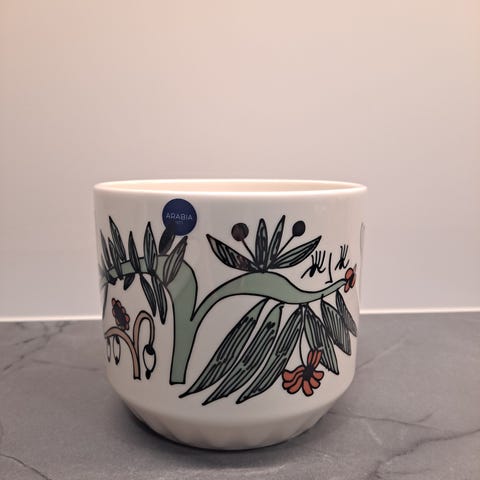 Käytetty, mutta ehjä ruukku, jäljet lähinnä sisäpinnalla. Korkeus aluslautasen kanssa 12cm, halkaisija 15cm.