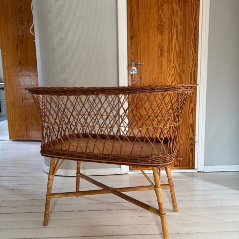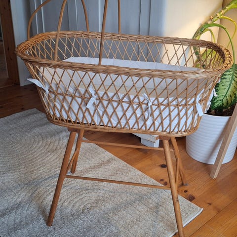 Rottinkinen vauvansänky. Jalustassa pyörät, joten helppo siirrellä huoneesta toiseen. Mukana on patja, kosteussuoja, lakana ja reunapehmuste.