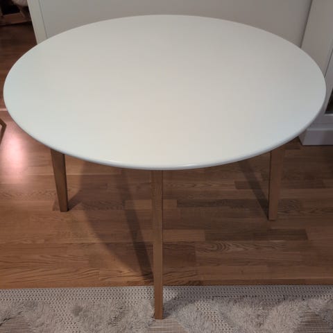 Jyskin pyöreä ruokapöytä (ø 105 cm) ja viisi tuolia. Pöydän kunto hyvä, tuolit ovat vaihtelevassa kunnossa. Voin lähettää kaikista tuoleista lisäkuvia tarvittaessa.