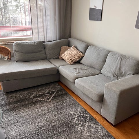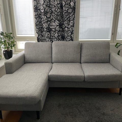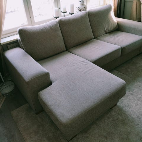 Sohva-divaanin osa. Toimii näinkin löhöilyyn. Sohvan oikealta puolelta puuttuu osa, joten sen puolen verhoilu ei ole täydellinen.