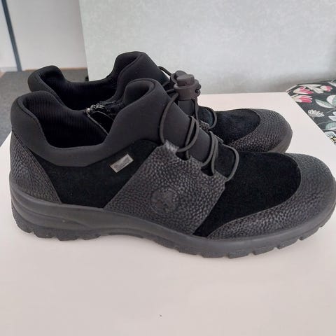 Rieker kävelykengät, koko 39. Väri musta. Nauhakiinnitys joustonauhalla ja säätölukolla. Kevyt kumipohja, matala kanta. Sopivat arkikäyttöön ja kevyeen ulkoiluun.