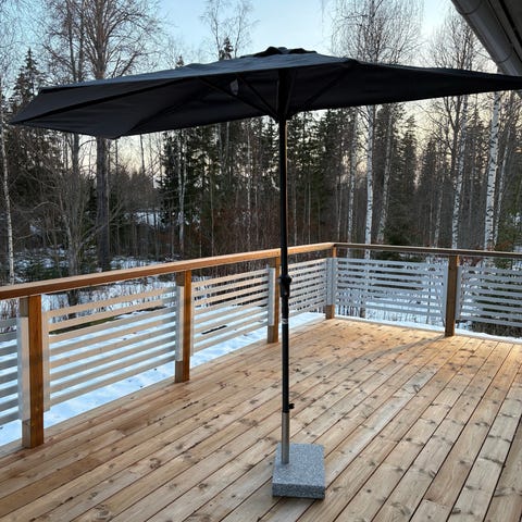 Maskusta viime kesänä ostettu Girola sivuvarjo, halkaisija 3 m, väriltään harmaa/antrasiitti.