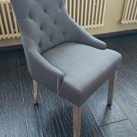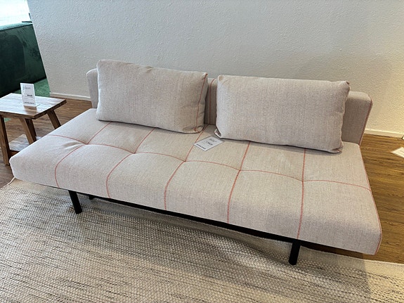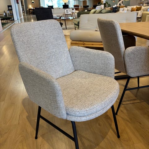 Tuoli on verhoiltu beigellä verhoilukankaalla. Istuimen runko on puuta. Tuolissa on mustaksi jauhemaalatut metallijalat.