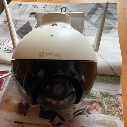 Myynnissä toimiva valvontakamera ja latauskaapeli.