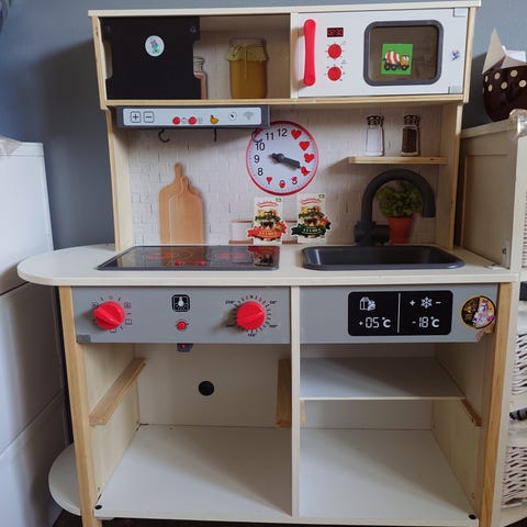 Myydään jo paljon leikitty ja elämää nähnyt ikean leikkikeittiö. Kolhuja löytyy ja varmasti joku kynänjäljikin, mutta yleisilmeeltään ihan kohtuullinen. Muutama ruuvi olis hyvä kiristää niin tulee tukeva. Levyn valot ei toimi, jotain kosketushäiriötä. Mukana kuvissa näkyviä leikkiastioita ja -ruokia, jotka kaipaa pesua. Toisessa kuvassa muoviset lelut ja toisessa puiset/metalliset.