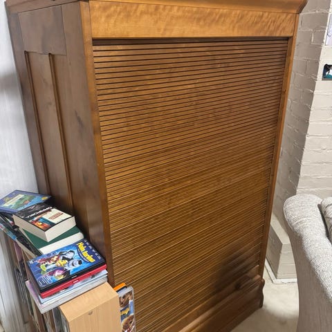 Erittäin hyväkuntoinen Boknäsin iso rulokaappi, jota ei saa enää uutena. Korkeus 130 cm, leveys 87 cm ja syvyys 60 cm. Sisältää kiinteät, sekä ulos vedettävän hyllyn. Taustalevyssä myös reiät johdoille. Nouto onnistuu Raumalta.