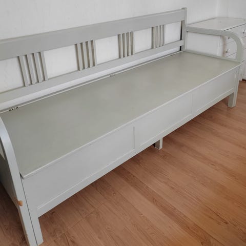 Hyväkuntoinen valkoinen puusohva, kannen alla säilytystilaa