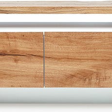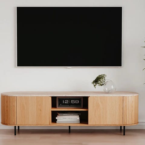 Upea ovaalinmuotoinen Nola-tv-taso tarjoaa tyylikkään ja toiminnallisen ratkaisun sisustukseen. Tammipaneelin, mustan metallin ja pyöristettyjen kulmien yhdistelmä luo tasapainoisen ja mielenkiintoisen ilmeen. Lisäksi tilaa säästävät liukuovet tarjoavat käytännöllisyyttä ja joustavuutta säilytysratkaisun käyttöön