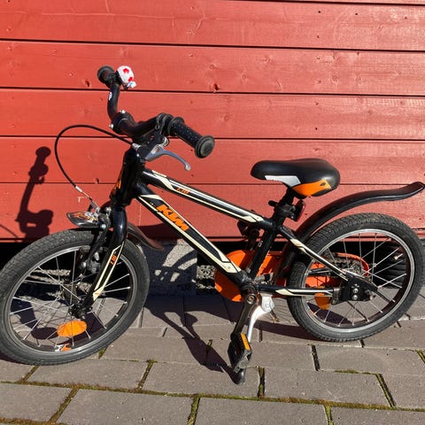 Hyvä KTM lasten polkupyörä 16" renkailla 4-6 vuotiaalle. Rungon väri valkoinen ja punainen, satulassa ja ketjusuojassa vaaleanpunaisia yksityiskohtia. Pyörässä on jalkajarru, etukäsijarru, lokasuojat, ketjusuoja, seisontatuki ja heijastimet. Lokasuoja hieman haljennut (kuvassa musta teippaus) ja ketjusuojasta pala irti (kuvassa), mutta nämä ei menoa haittaa.