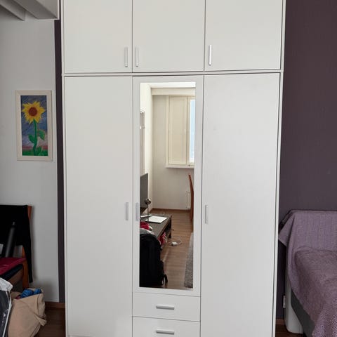 Hyväkuntoinen täyspuinen vaatekaappi tarpeettomana. Hyllytilaa reilusti, toisella puolella pieni henkaritanko ja keskellä laatikosto. Kaappi on tukeva ja jämäkkä rakenteinen.