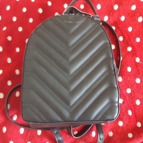 Reppu vaaleanturkoosia muovia. Repussa on läppäkansi magneettikiinnityksellä ja vetoketjutasku takapuolella. Sisäosa on vuoritettu kuviollisella kankaalla ja sisältää useita lokeroita pientavaroille. Säädettävät olkahihnat ja ylhäällä kantokahva helpottavat kantamista. Etuläpän alla reikä, ei näy käytössä. Toridiili tai nouto.