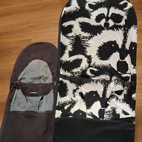 Babybjörn sitteri ja vaaleanpunainen rusettipäällinen (Joiku). Kankaassa näkyy tahroja mitä en ole yrittänyt pestä tahranpesuaineella pois. Päällisen olen tilannut itse ja se on ollut yhdellä vauvalla käytössä. Sitteri on ostettu meille käytettynä. Rusetissa on lenkki mihin saa kätevästi lelun kiinni. Myyn suoraan käytöstä pois.