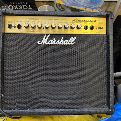 Marshall MS-2R minivahvistin sähkökitaralle. Kompakti, paristokäyttöinen vahvistin, jossa yksi kaiutin ja etupaneelissa äänenvoimakkuuden, sävyn ja overdrive-kanavan säätimet. Laitteessa on kitaratuloliitäntä, kuuloke-/linjalähtö sekä virtaliitäntä erilliselle verkkolaitteelle. Takana vyöklipsi ja paristokotelo. Punainen kotelo ja musta eturitilä valkoisella Marshall-logolla.