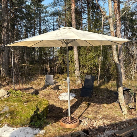 Terassivarjo neliönmuotoisella mustalla kankaalla. Halkaisija 275cm. Varjo on sivuvarjotyyppinen, jossa jalka sijaitsee varjon sivussa, mikä vapauttaa tilaa pöydän ja tuolien ympäriltä. Varjoa voi käännellä eri asentoihin. Soveltuu käytettäväksi terassilla tai parvekkeella antamaan suojaa auringolta. Varjo voidaan sulkea ja sitoa kokoon säilytystä varten. Jalusta näkyy kuvissa ja kuuluu kokonaisuuteen samoin kuin 4kpl betonilaattoja varjon paikallaan pitämiseen (ovh. 7€/kpl)