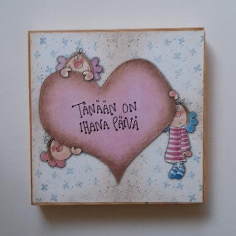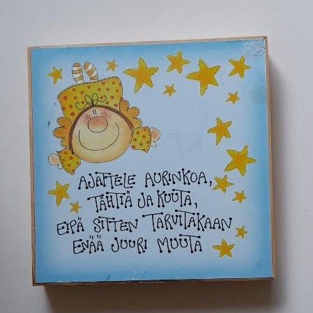 Taulu esimerkiksi lapsen syntymän jälkeen. Taulussa teksti: ”Sinä olet parasta mitä meille voi tapahtua”