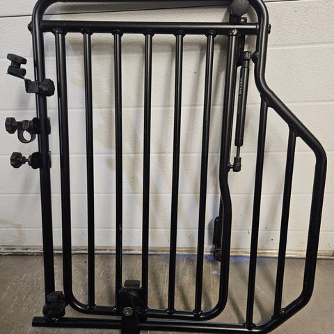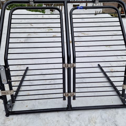 Veräjässä käytönjälkiä ja toinen ovi hieman kankeampi. Toisen puolen pingotustapista, puuttuu pehmuste, ei vaikuta käyttöön.