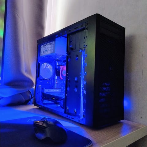 Sivu paneeli puuttuu, mutta ei oo menoa haitannut. Pelattu joka päivä tällä koneella. Kevyemmät pelit pyörii hyvin.