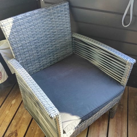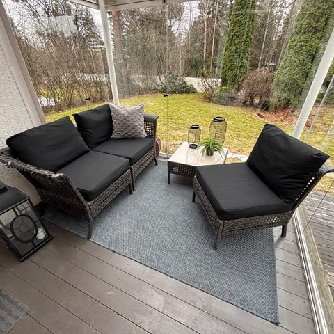 Polyrottinki terassisohva musta. Kolmen istuttava ulkosohva, jossa kaarevat käsinojat ja korkea selkänoja. Valmistettu säänkestävästä polyrottinkipunoksesta. Mukana harmaa istuinpatja.