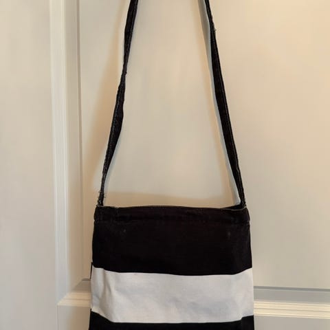 Musta, Marimekon olkalaukku, muovitasku hajonnut muuten ehjä.